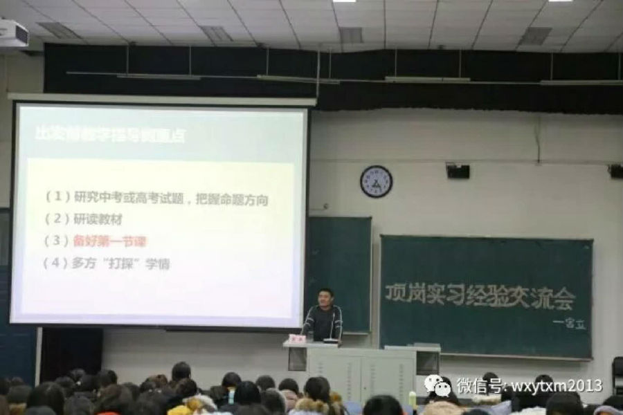 在实习中期及后期阶段,同学们要更为侧重对自身课堂的完善,不断帮助学生提高上课积极性。宫老师指出,同学们可以先录制讲课视频,再请当地教师和一同顶岗的同学们指出问题,实行“炮轰”式指导。宫老师建议同学们要在课余时期多次举办经验交流会。面对不同时期,同学们要对出现的不同问题进行具体问题具体分析,还要注意课堂的灵活性和课堂效果。