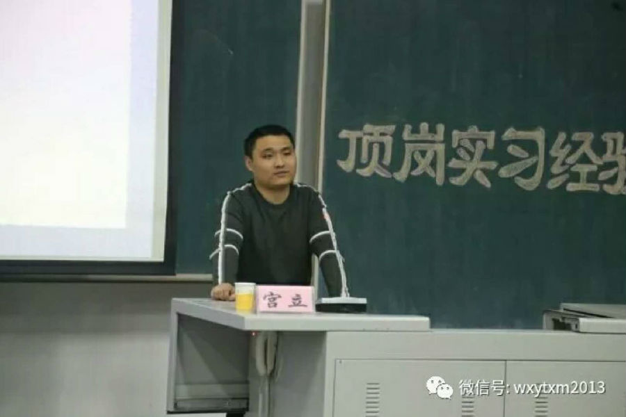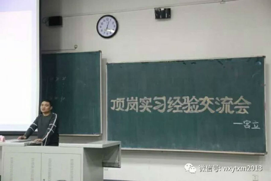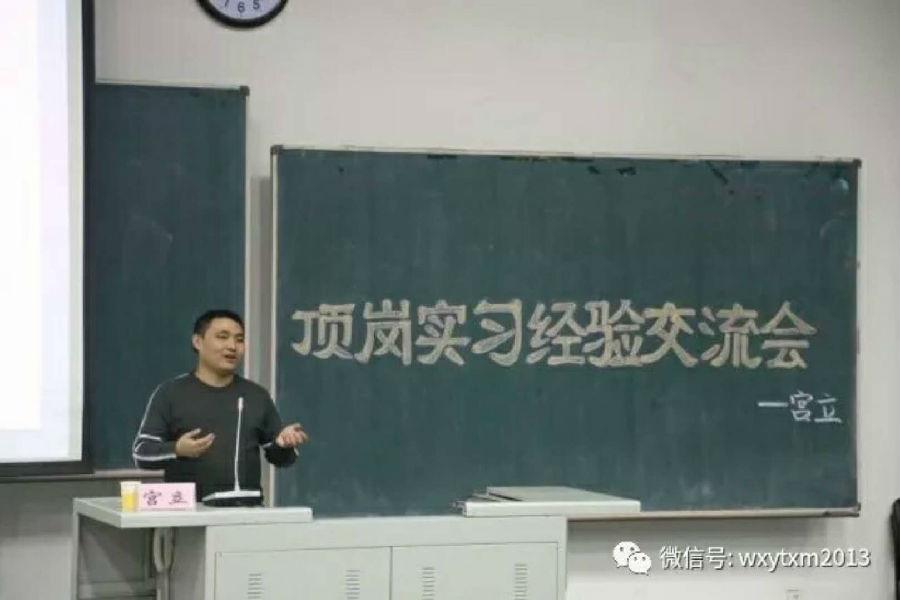 交流会伊始,宫立老师以季羡林先生日记中的一些内容来活跃氛围,拉进了与同学们的关系。然后,宫老师以“稇载而归‘漫漫’实习路”为标题,将实习分为初期、中期和后期三个板块,并以所遇问题及解决方法为细支,开始对同学们进行顶岗实习经验的交流传授。