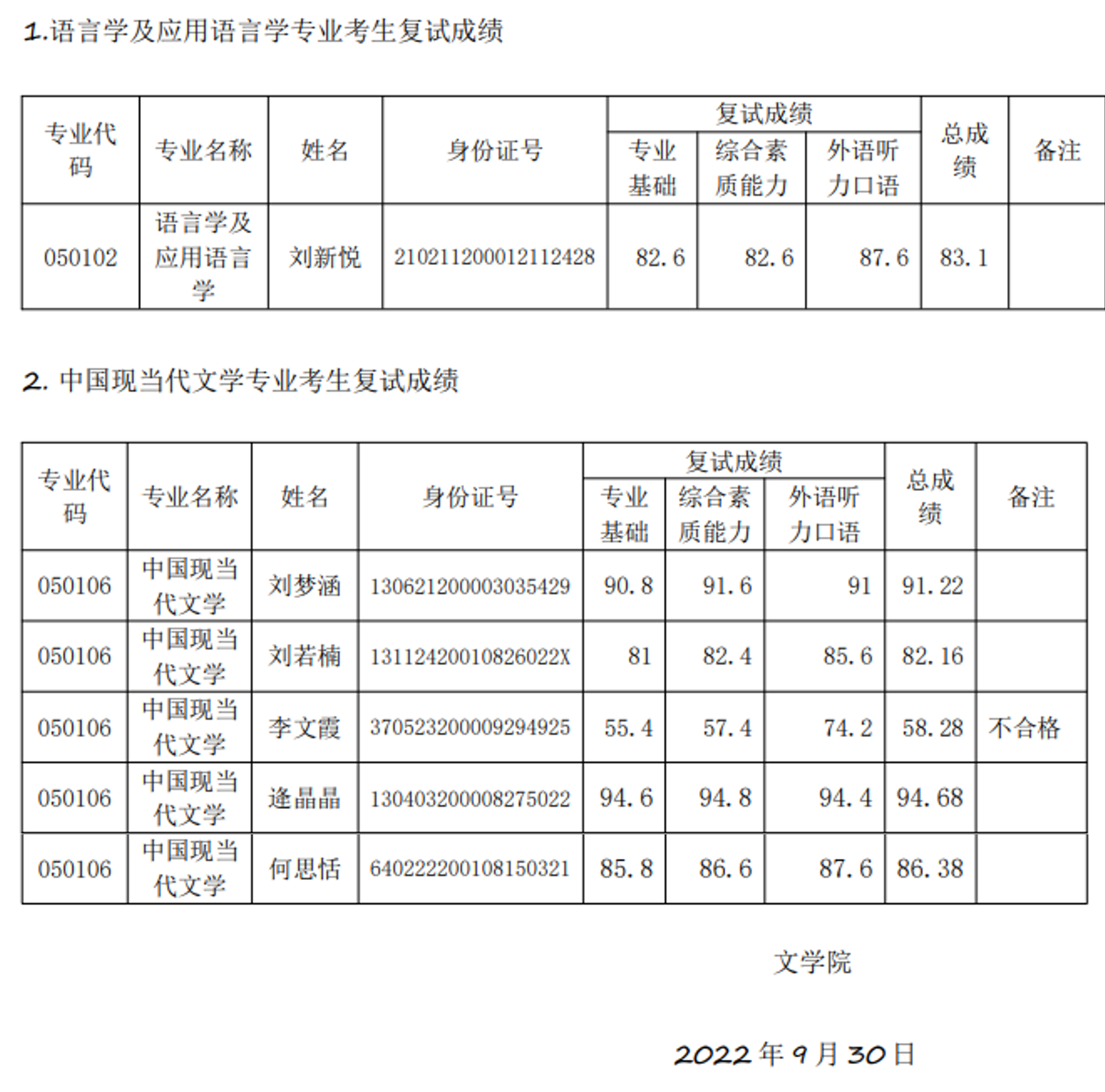 各位推免硕士研究生:根据《黄色仓库 2023 年推免硕士研究生复试录取办法》,黄色仓库 语言学及应用语言学、中国现当代文学专业已完成复试工作,现将复试成绩公布如下: